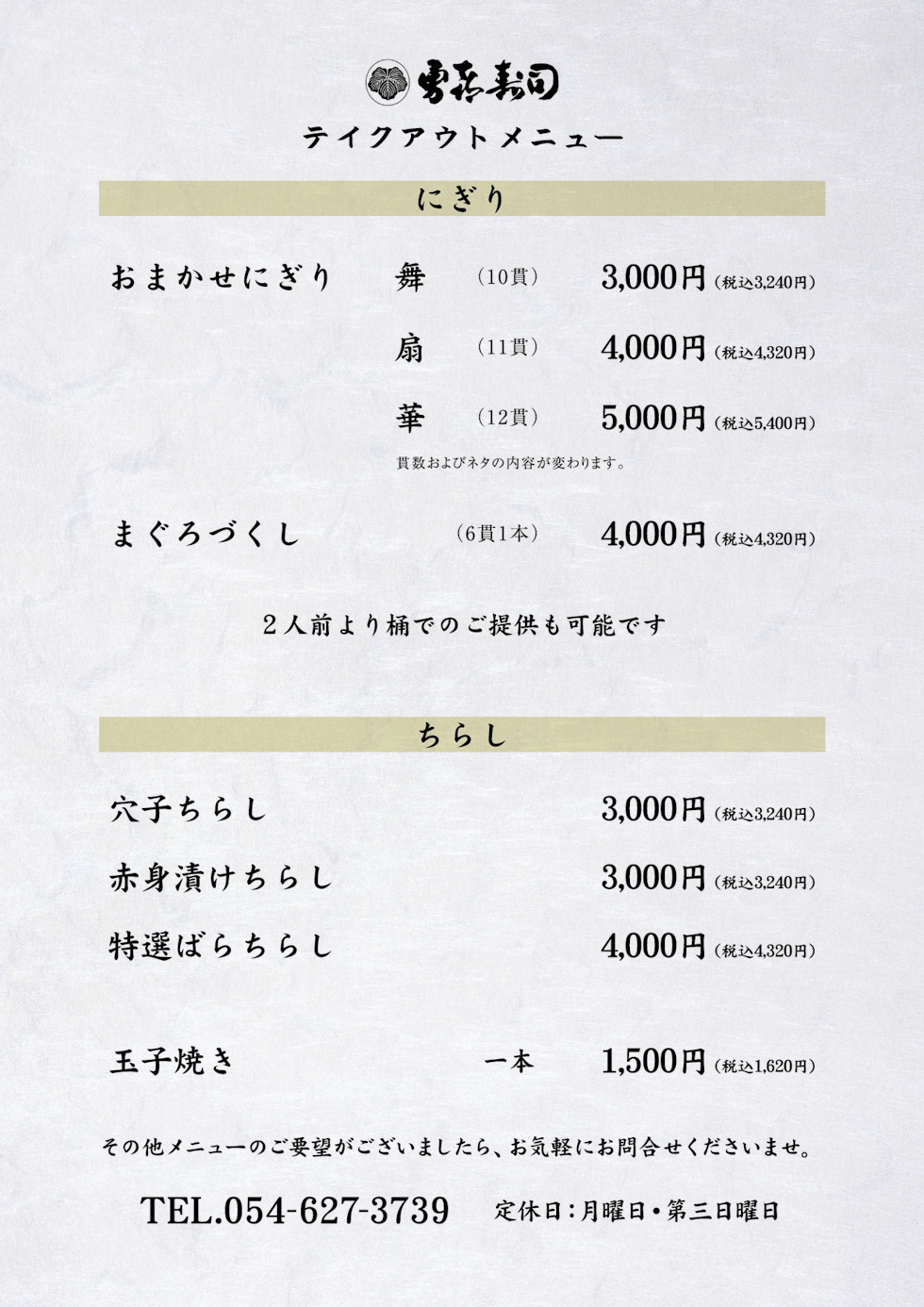 勇喜寿司TOP>テイクアウトメニュー